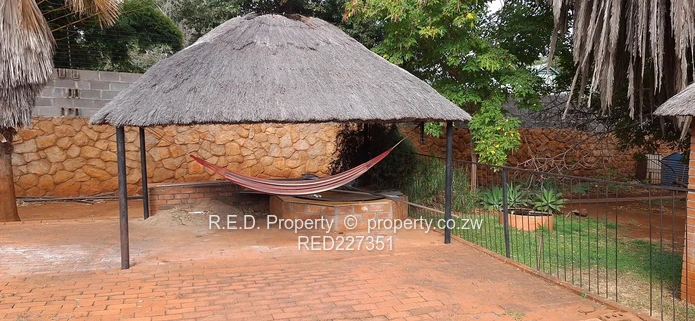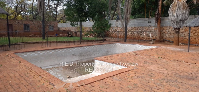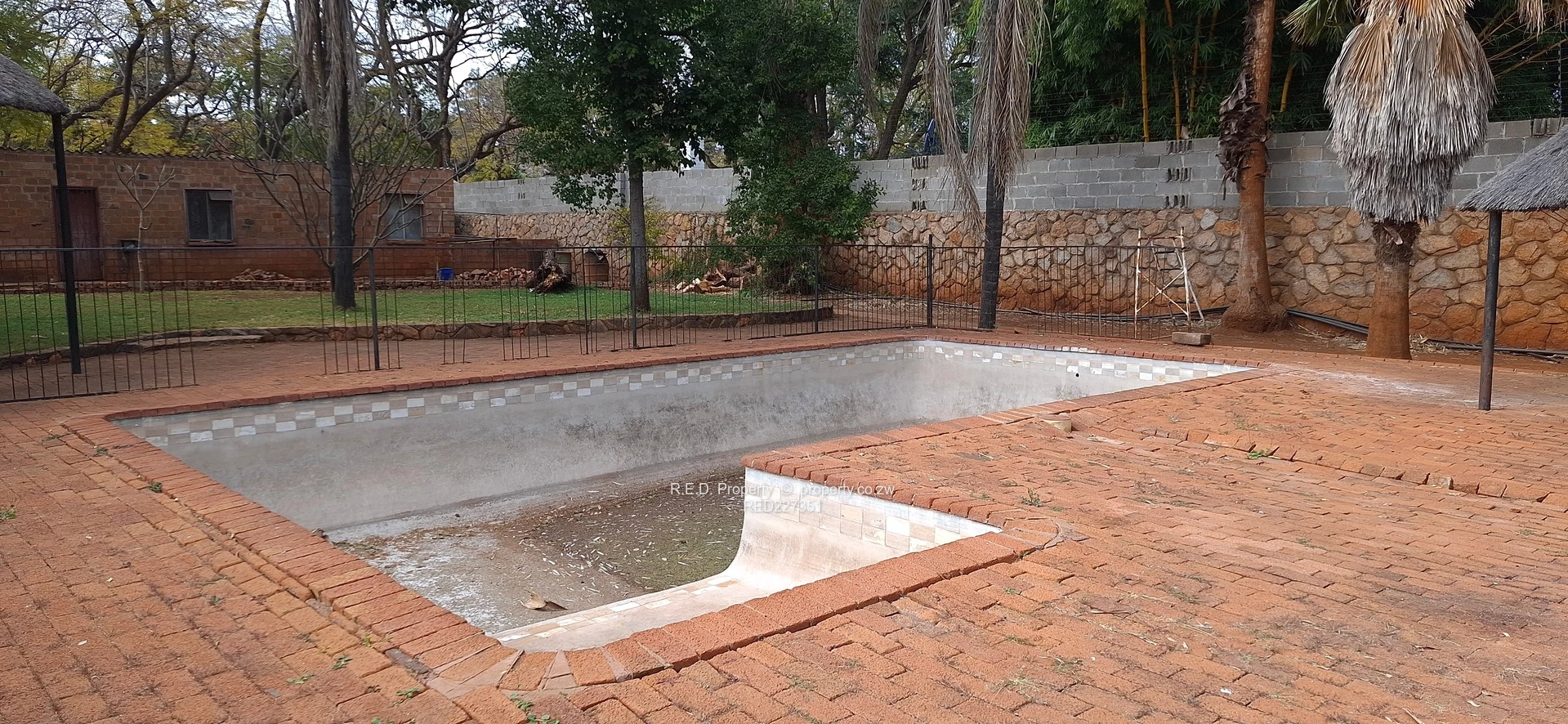 Outdoor features include a double carport, a storeroom with an additional carport, and a borehole to supplement water supply. A non-functioning swimming pool with a gazebo offers scope for restoration and entertainment. The entire property is securely walled and gated.